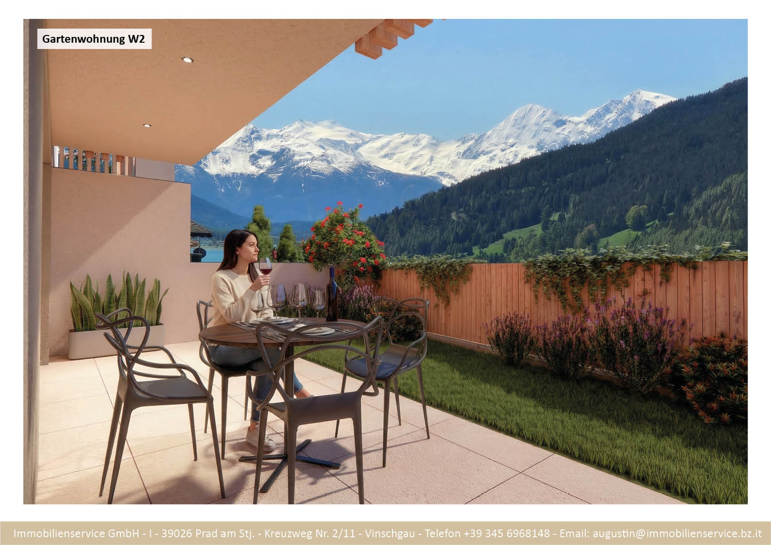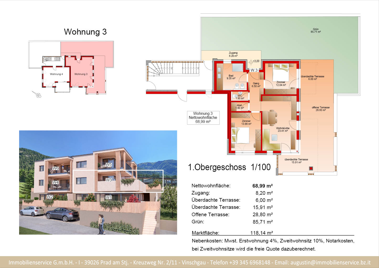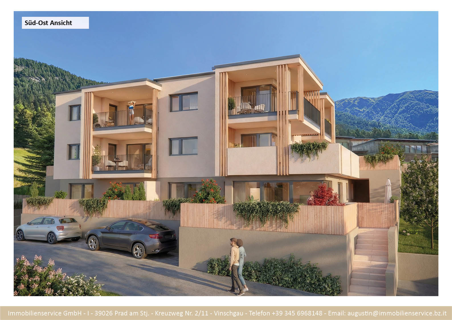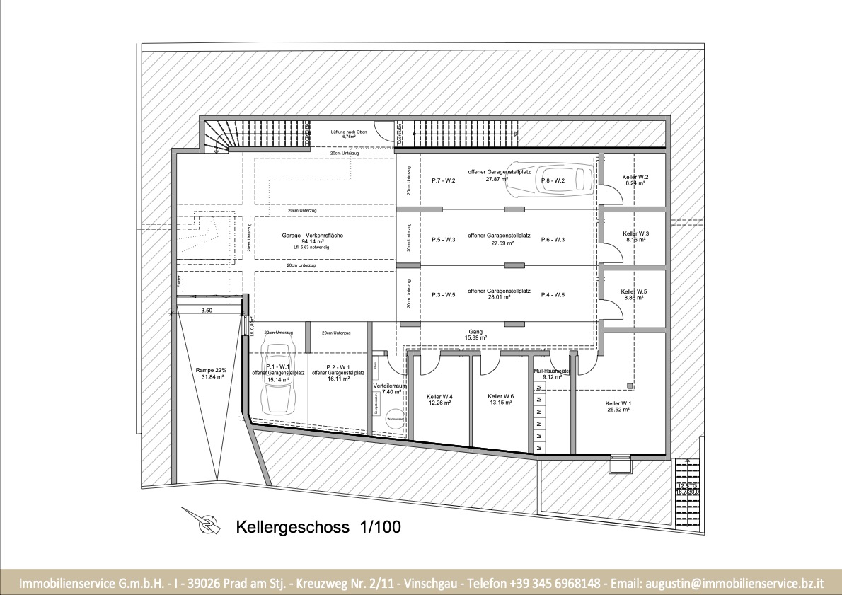 Im Tiefgeschoss befinden sich die Garagenplätze und Kellerräume, sowie die Räume für die Haustechnik. Im Erdgeschoss entstehen zwei Terrassenwohnungen mit Grünflächen (W1 und W2). Diese zwei Wohnungen unterliegen der sogenannten Konvention lt. Art 39 des Landesgesetzes und dürfen nicht als Zweitwohnsitz verwendet werden. Im ersten Obergeschoss entstehen ebenfalls zwei Wohnungen mit schönen Aussichtsloggien und Gartenflächen (W3 und W4). Die Wohnung 4 unterliegt auch der Konvention lt. Art. 39 des Landesgesetzes und darf nicht als Zweitwohnsitz verwendet werden. Die Wohnung 3 ist als Zweitwohnsitz bzw. Ferienwohnung zugelassen. Im zweiten Obergeschoss entstehen zwei Wohnungen mit besonders schönen überdachten Aussichtsterrassen (W5 und W6). Die Wohnung 6 unterliegt der Konvention lt. Art. 39 des Landesgesetzes und darf nicht als Zweitwohnsitz verwendet werden. Die Wohnung 5 ist als Zweitwohnsitz bzw. Ferienwohnung zugelassen.