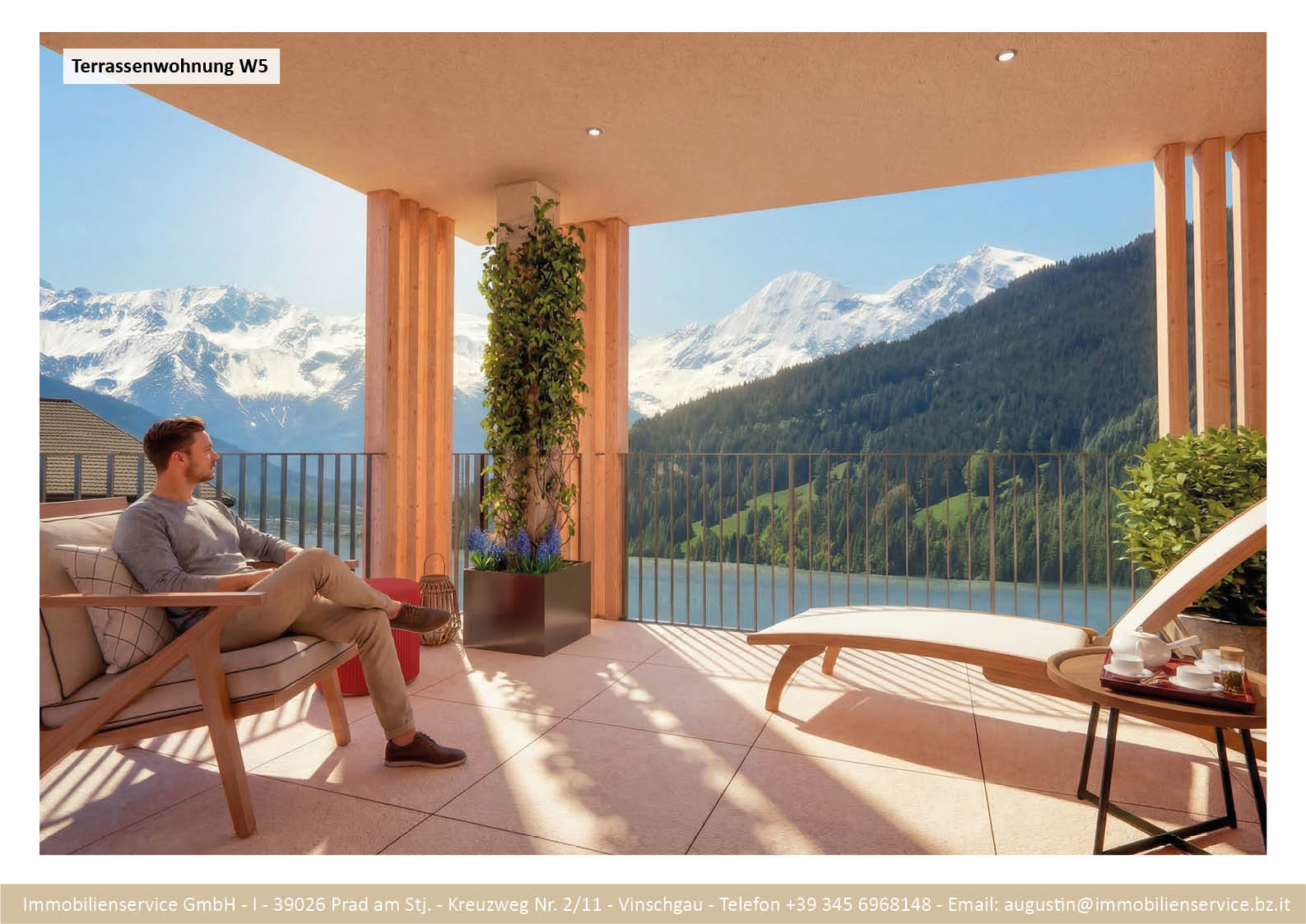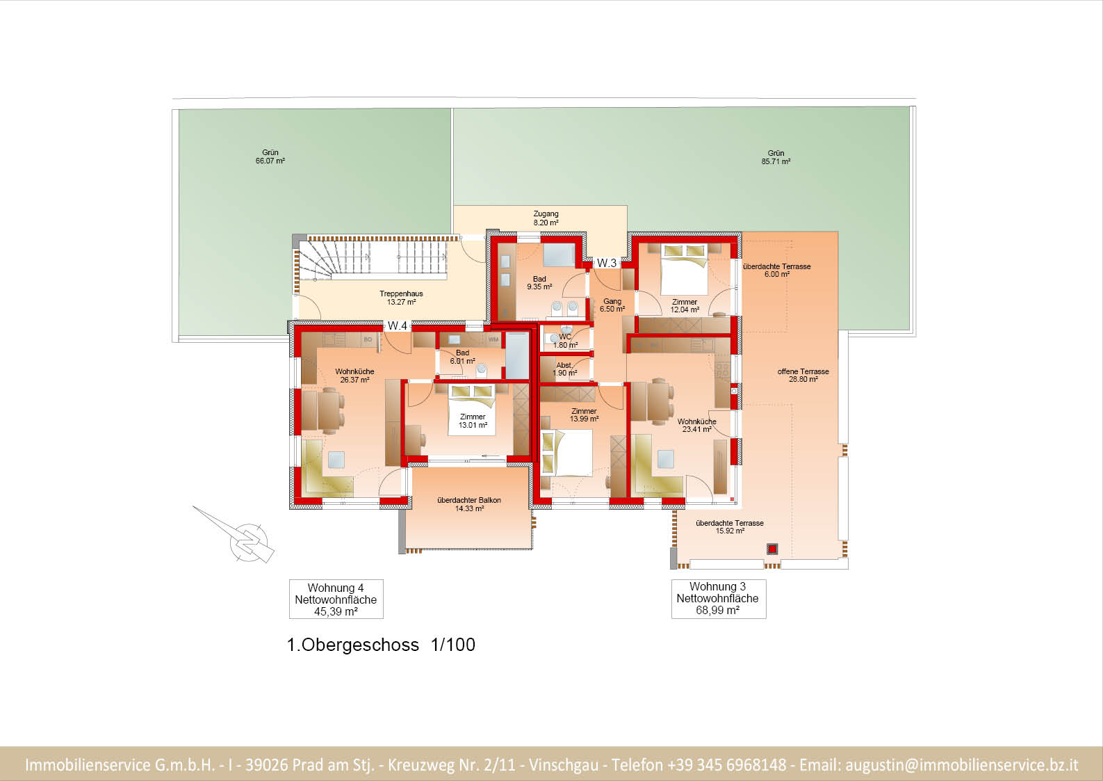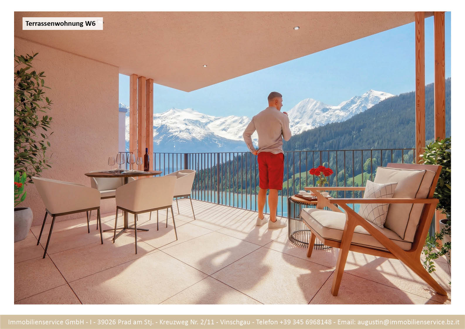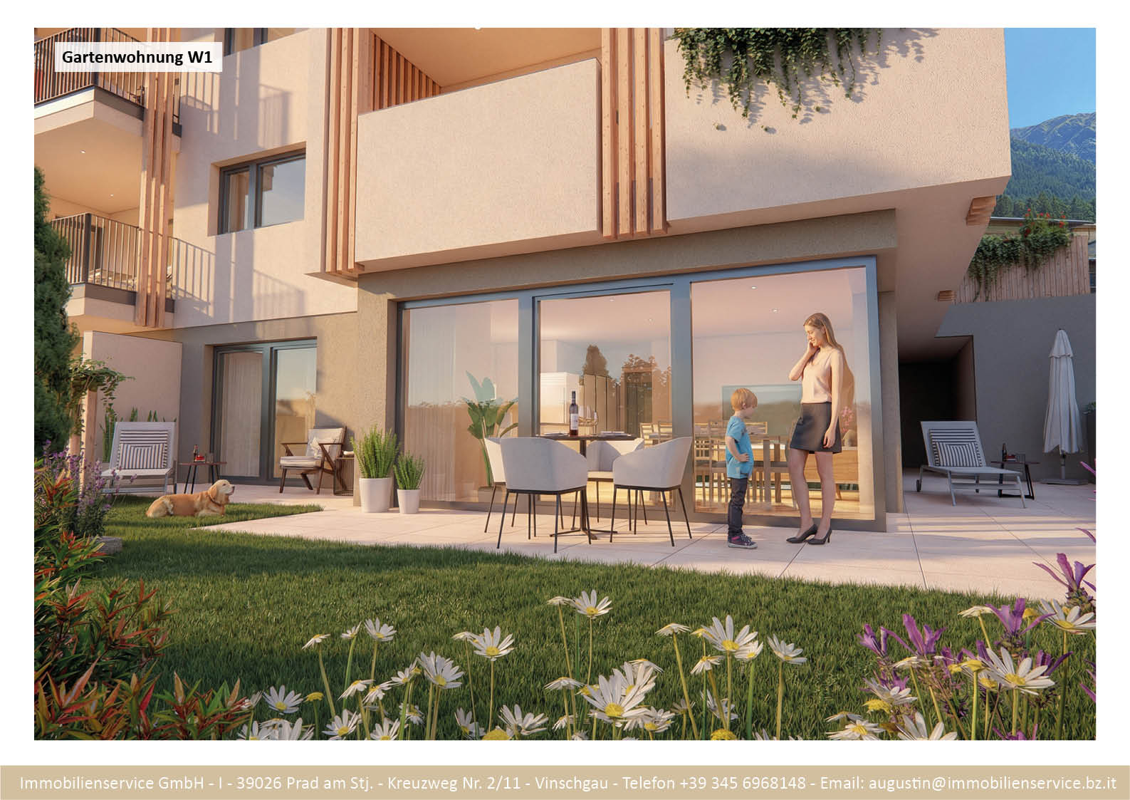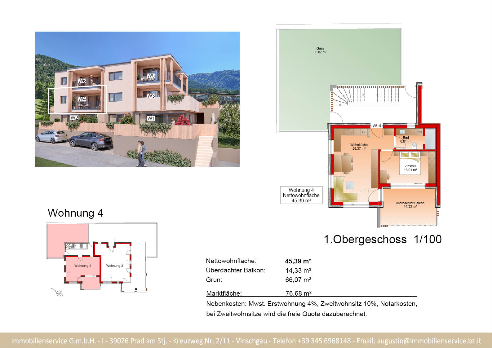 Im Tiefgeschoss befinden sich die Garagenplätze und Kellerräume, sowie die Räume für die Haustechnik. Im Erdgeschoss entstehen zwei Terrassenwohnungen mit Grünflächen (W1 und W2). Diese zwei Wohnungen unterliegen der sogenannten Konvention lt. Art 39 des Landesgesetzes und dürfen nicht als Zweitwohnsitz verwendet werden. Im ersten Obergeschoss entstehen ebenfalls zwei Wohnungen mit schönen Aussichtsloggien und Gartenflächen (W3 und W4). Die Wohnung 4 unterliegt auch der Konvention lt. Art. 39 des Landesgesetzes und darf nicht als Zweitwohnsitz verwendet werden. Die Wohnung 3 ist als Zweitwohnsitz bzw. Ferienwohnung zugelassen. Im zweiten Obergeschoss entstehen zwei Wohnungen mit besonders schönen überdachten Aussichtsterrassen (W5 und W6). Die Wohnung 6 unterliegt der Konvention lt. Art. 39 des Landesgesetzes und darf nicht als Zweitwohnsitz verwendet werden. Die Wohnung 5 ist als Zweitwohnsitz bzw. Ferienwohnung zugelassen.