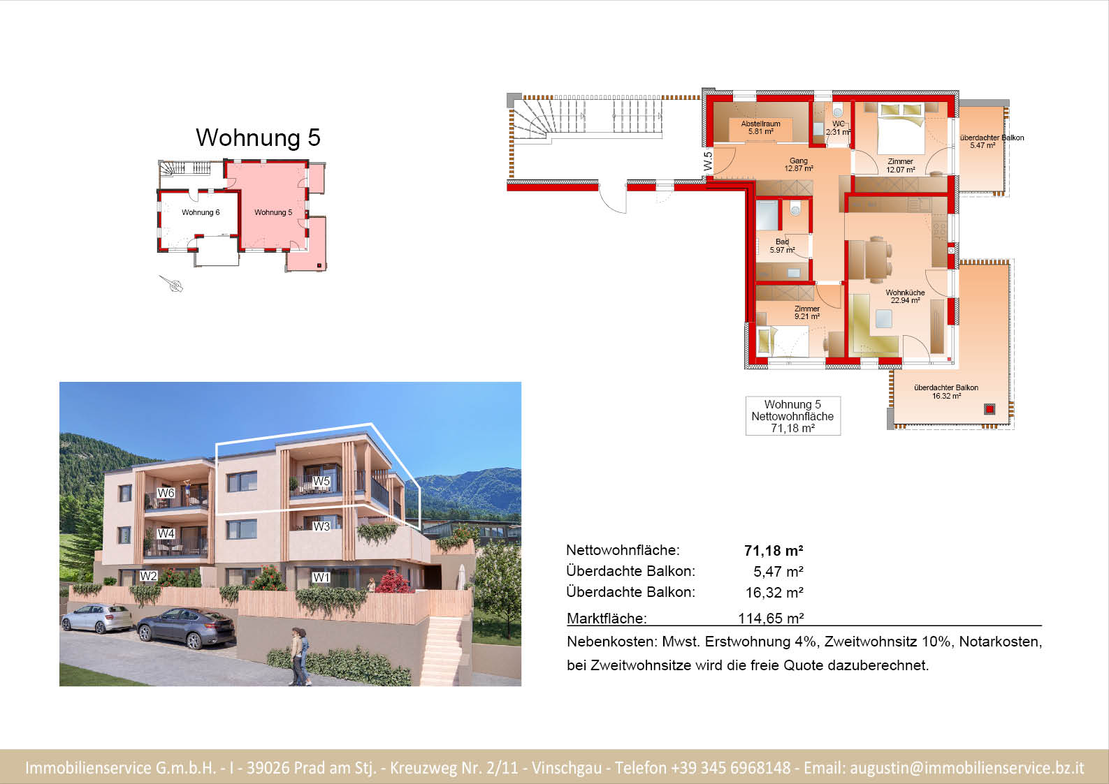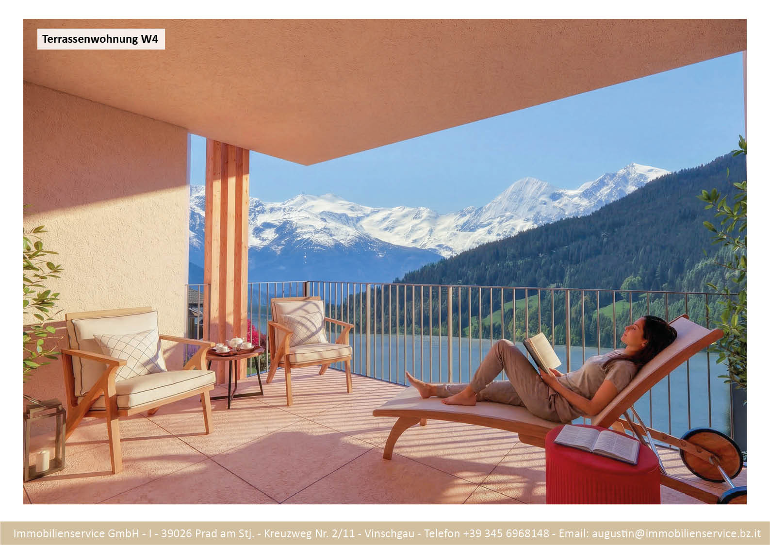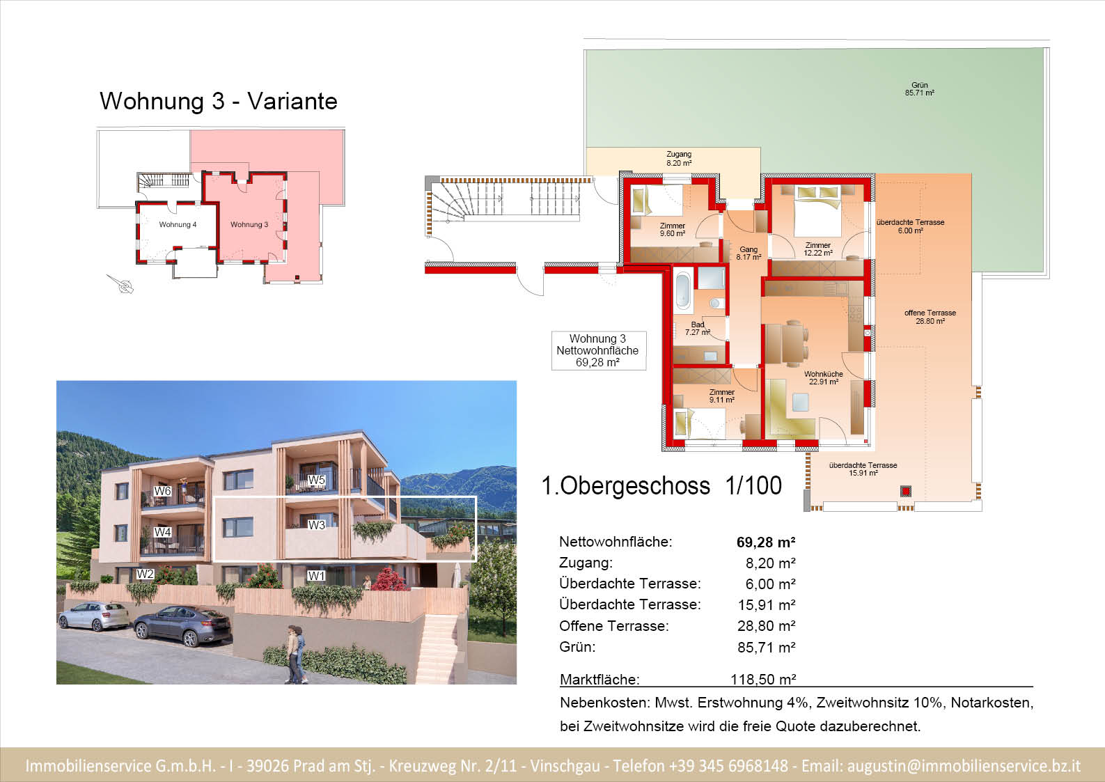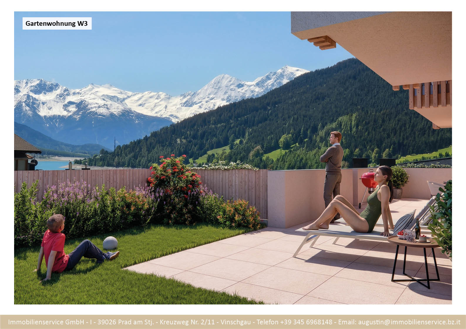 Im Tiefgeschoss befinden sich die Garagenplätze und Kellerräume, sowie die Räume für die Haustechnik. Im Erdgeschoss entstehen zwei Terrassenwohnungen mit Grünflächen (W1 und W2). Diese zwei Wohnungen unterliegen der sogenannten Konvention lt. Art 39 des Landesgesetzes und dürfen nicht als Zweitwohnsitz verwendet werden. Im ersten Obergeschoss entstehen ebenfalls zwei Wohnungen mit schönen Aussichtsloggien und Gartenflächen (W3 und W4). Die Wohnung 4 unterliegt auch der Konvention lt. Art. 39 des Landesgesetzes und darf nicht als Zweitwohnsitz verwendet werden. Die Wohnung 3 ist als Zweitwohnsitz bzw. Ferienwohnung zugelassen. Im zweiten Obergeschoss entstehen zwei Wohnungen mit besonders schönen überdachten Aussichtsterrassen (W5 und W6). Die Wohnung 6 unterliegt der Konvention lt. Art. 39 des Landesgesetzes und darf nicht als Zweitwohnsitz verwendet werden. Die Wohnung 5 ist als Zweitwohnsitz bzw. Ferienwohnung zugelassen.