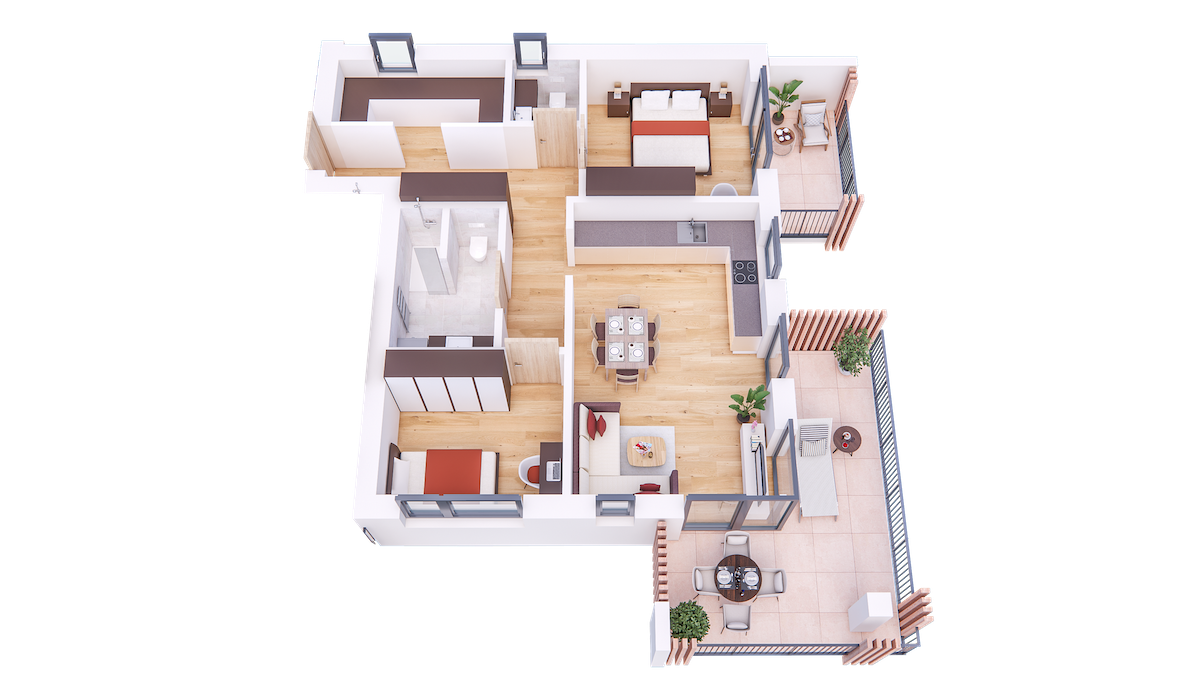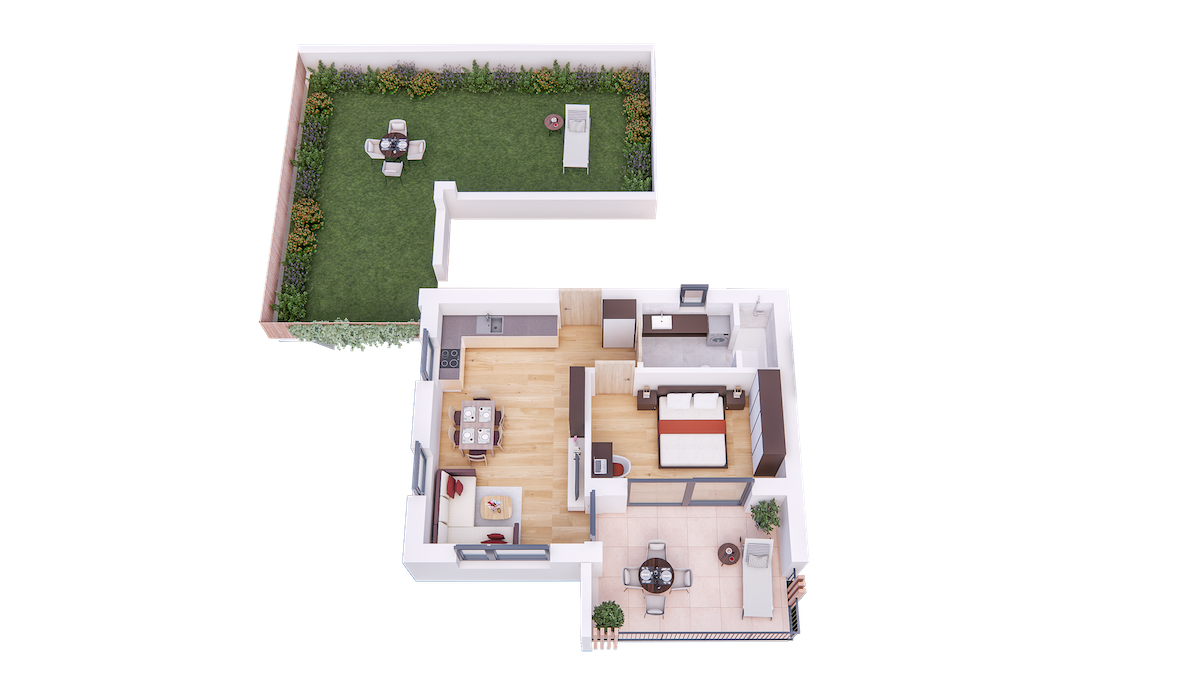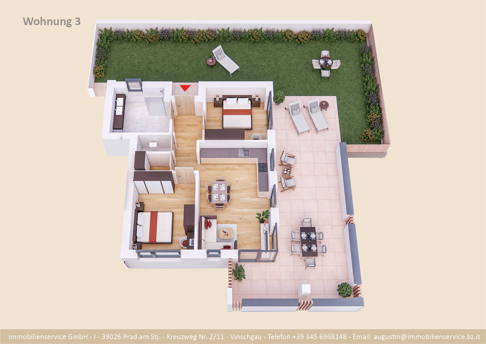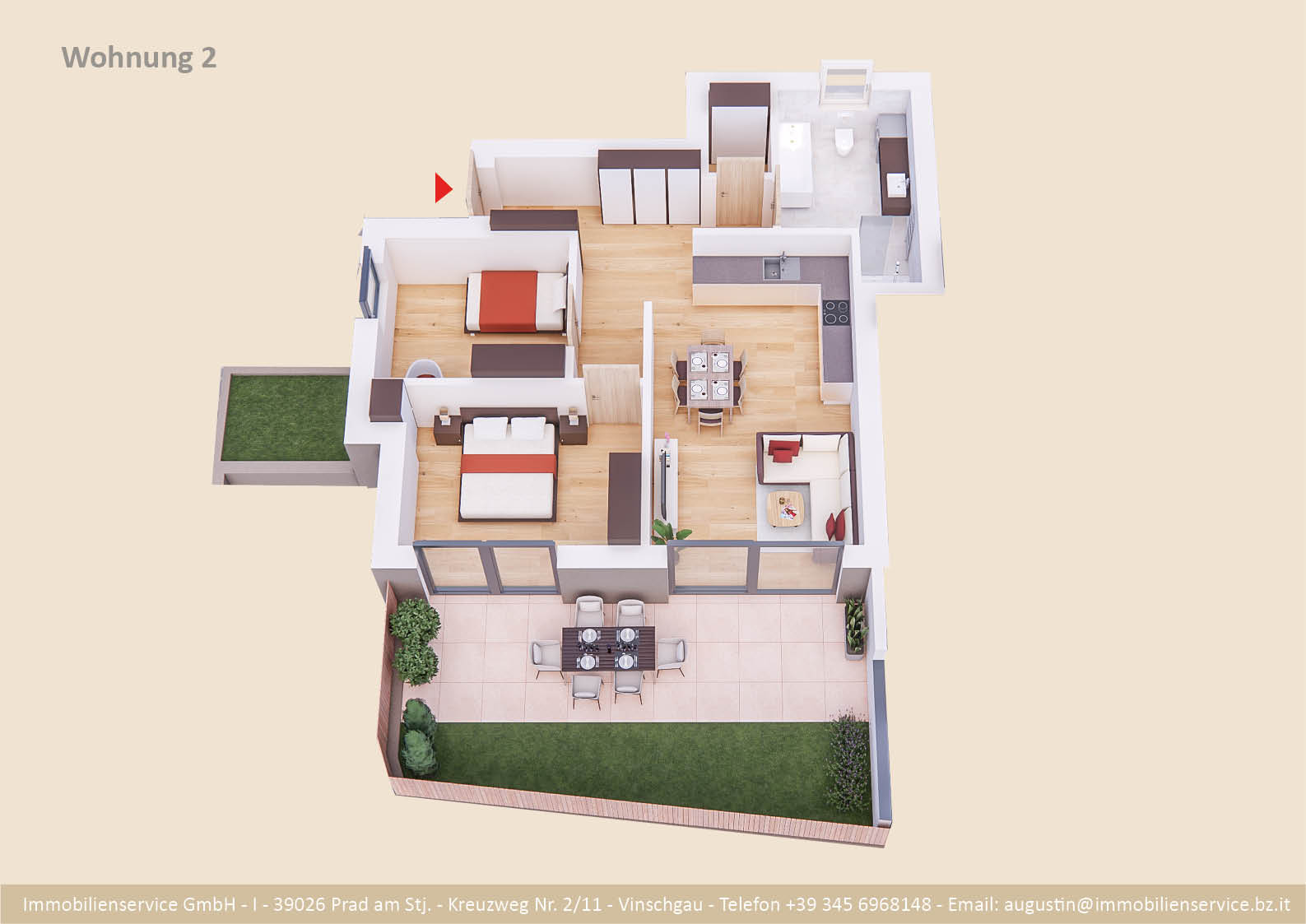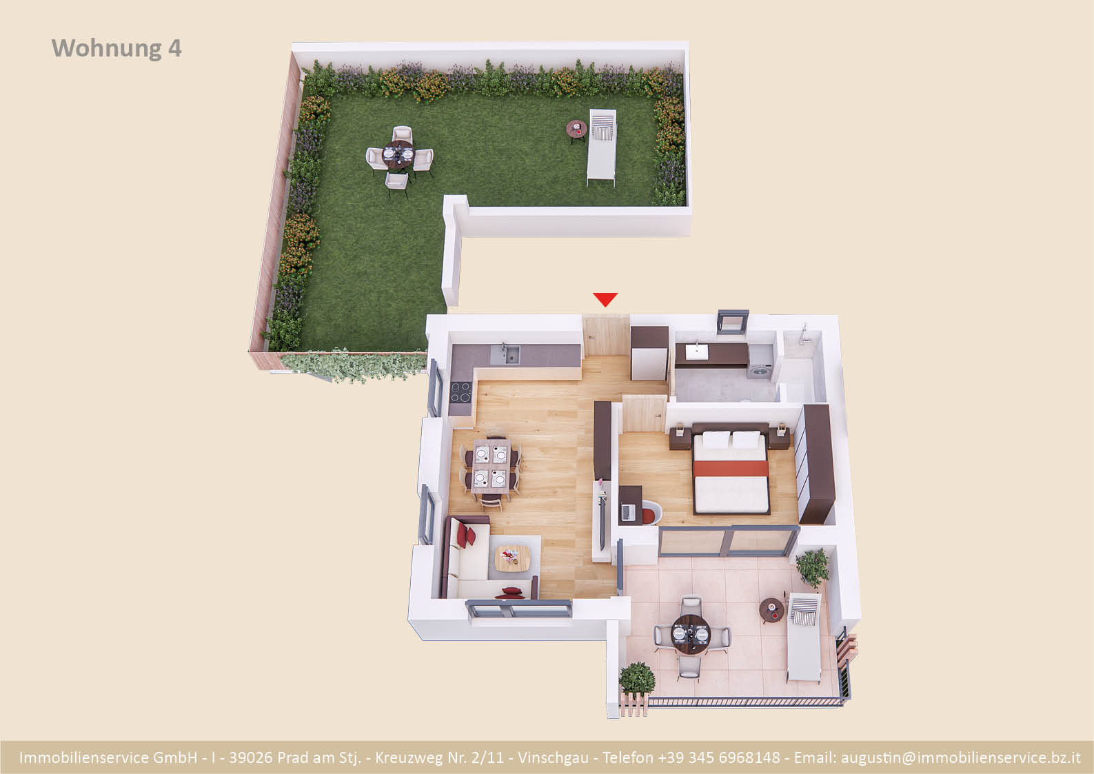 Im Tiefgeschoss befinden sich die Garagenplätze und Kellerräume, sowie die Räume für die Haustechnik. Im Erdgeschoss entstehen zwei Terrassenwohnungen mit Grünflächen (W1 und W2). Diese zwei Wohnungen unterliegen der sogenannten Konvention lt. Art 39 des Landesgesetzes und dürfen nicht als Zweitwohnsitz verwendet werden. Im ersten Obergeschoss entstehen ebenfalls zwei Wohnungen mit schönen Aussichtsloggien und Gartenflächen (W3 und W4). Die Wohnung 4 unterliegt auch der Konvention lt. Art. 39 des Landesgesetzes und darf nicht als Zweitwohnsitz verwendet werden. Die Wohnung 3 ist als Zweitwohnsitz bzw. Ferienwohnung zugelassen. Im zweiten Obergeschoss entstehen zwei Wohnungen mit besonders schönen überdachten Aussichtsterrassen (W5 und W6). Die Wohnung 6 unterliegt der Konvention lt. Art. 39 des Landesgesetzes und darf nicht als Zweitwohnsitz verwendet werden. Die Wohnung 5 ist als Zweitwohnsitz bzw. Ferienwohnung zugelassen.