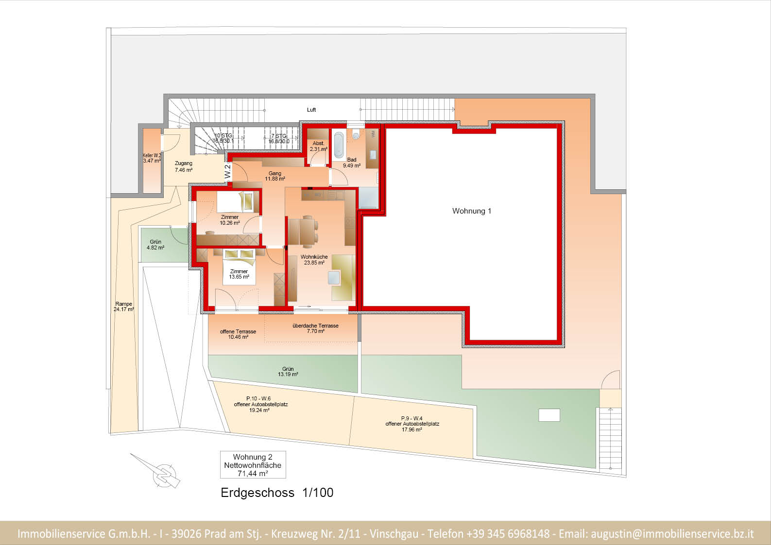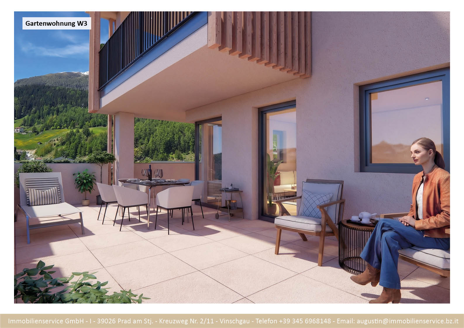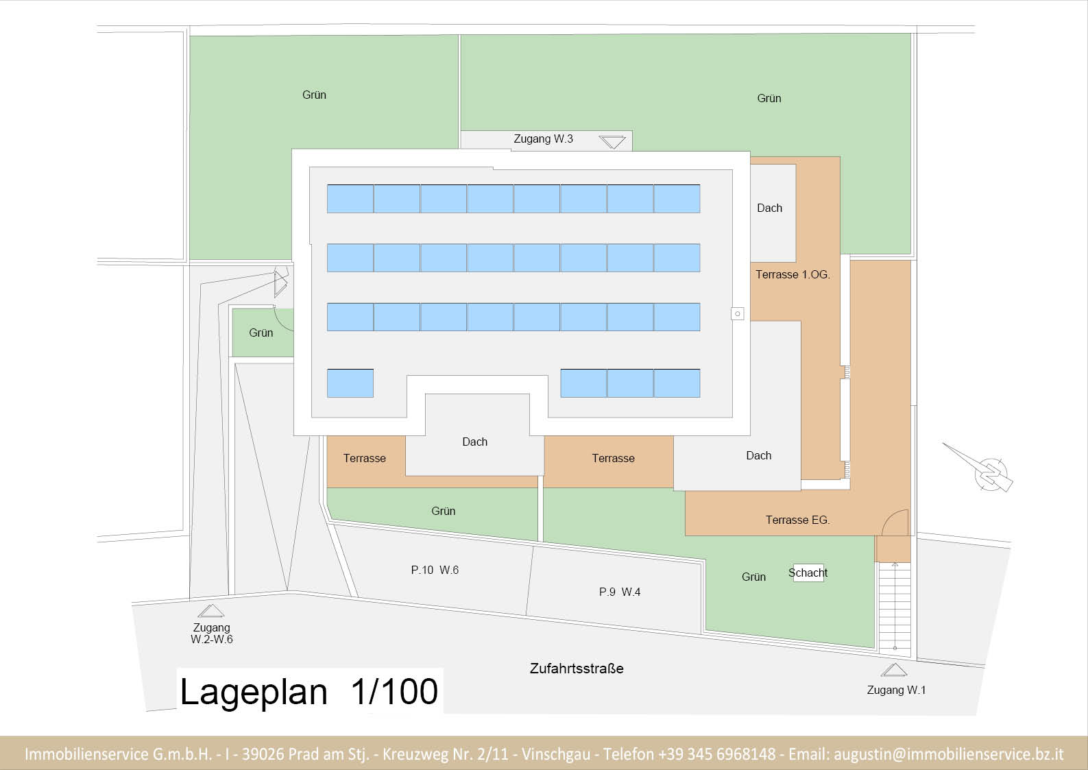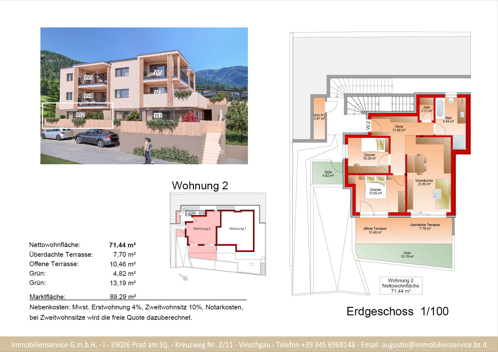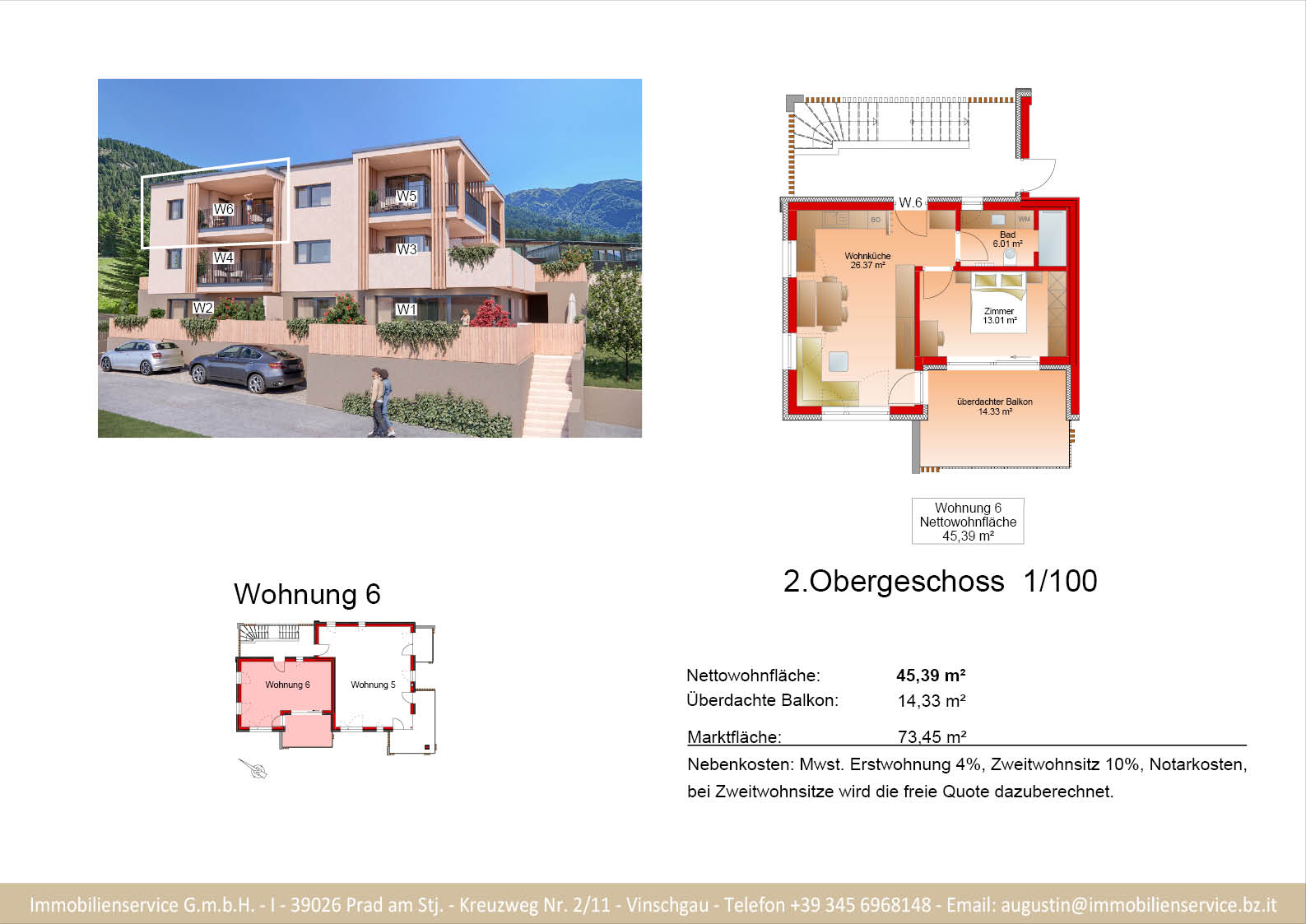 Im Tiefgeschoss befinden sich die Garagenplätze und Kellerräume, sowie die Räume für die Haustechnik. Im Erdgeschoss entstehen zwei Terrassenwohnungen mit Grünflächen (W1 und W2). Diese zwei Wohnungen unterliegen der sogenannten Konvention lt. Art 39 des Landesgesetzes und dürfen nicht als Zweitwohnsitz verwendet werden. Im ersten Obergeschoss entstehen ebenfalls zwei Wohnungen mit schönen Aussichtsloggien und Gartenflächen (W3 und W4). Die Wohnung 4 unterliegt auch der Konvention lt. Art. 39 des Landesgesetzes und darf nicht als Zweitwohnsitz verwendet werden. Die Wohnung 3 ist als Zweitwohnsitz bzw. Ferienwohnung zugelassen. Im zweiten Obergeschoss entstehen zwei Wohnungen mit besonders schönen überdachten Aussichtsterrassen (W5 und W6). Die Wohnung 6 unterliegt der Konvention lt. Art. 39 des Landesgesetzes und darf nicht als Zweitwohnsitz verwendet werden. Die Wohnung 5 ist als Zweitwohnsitz bzw. Ferienwohnung zugelassen.