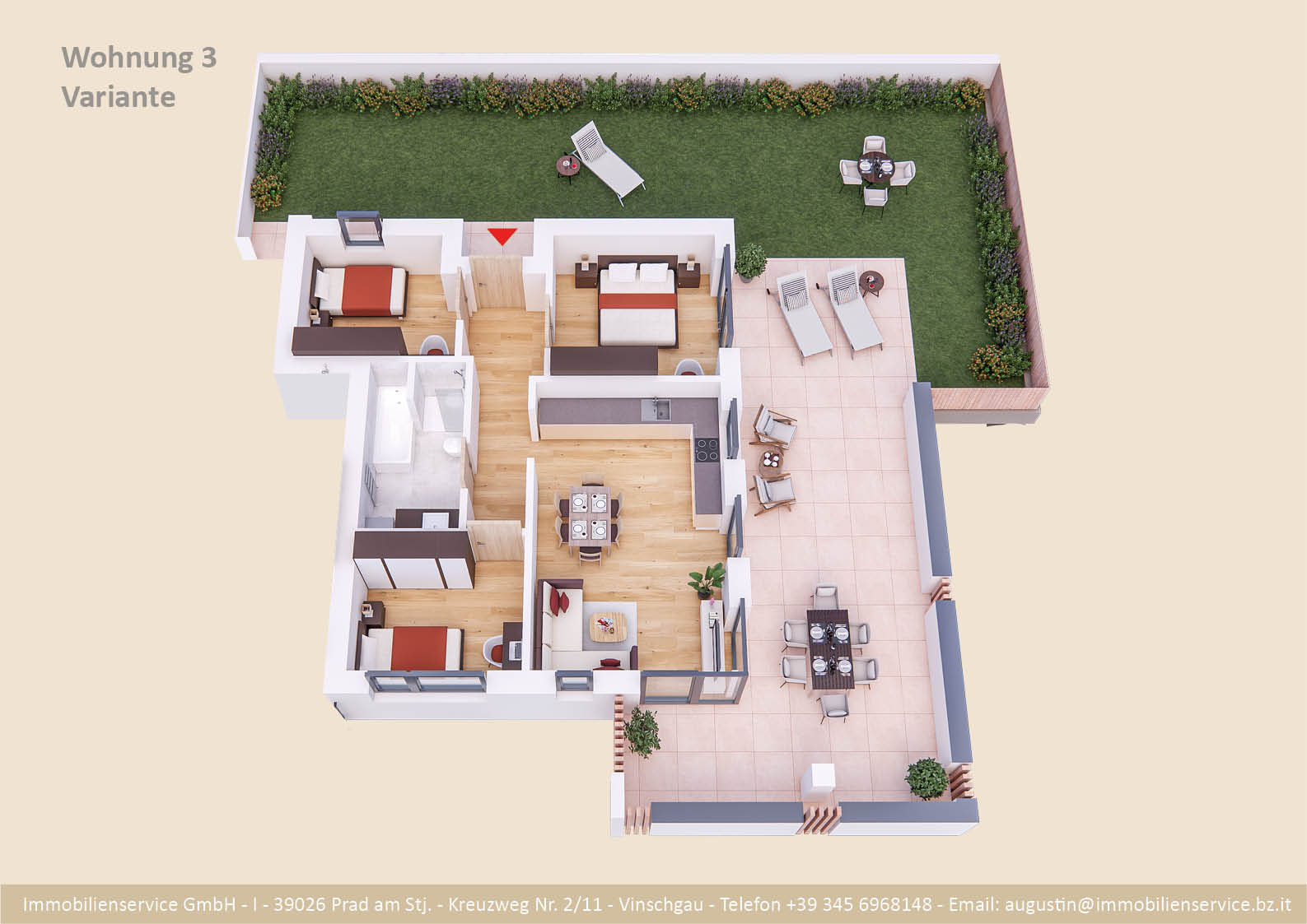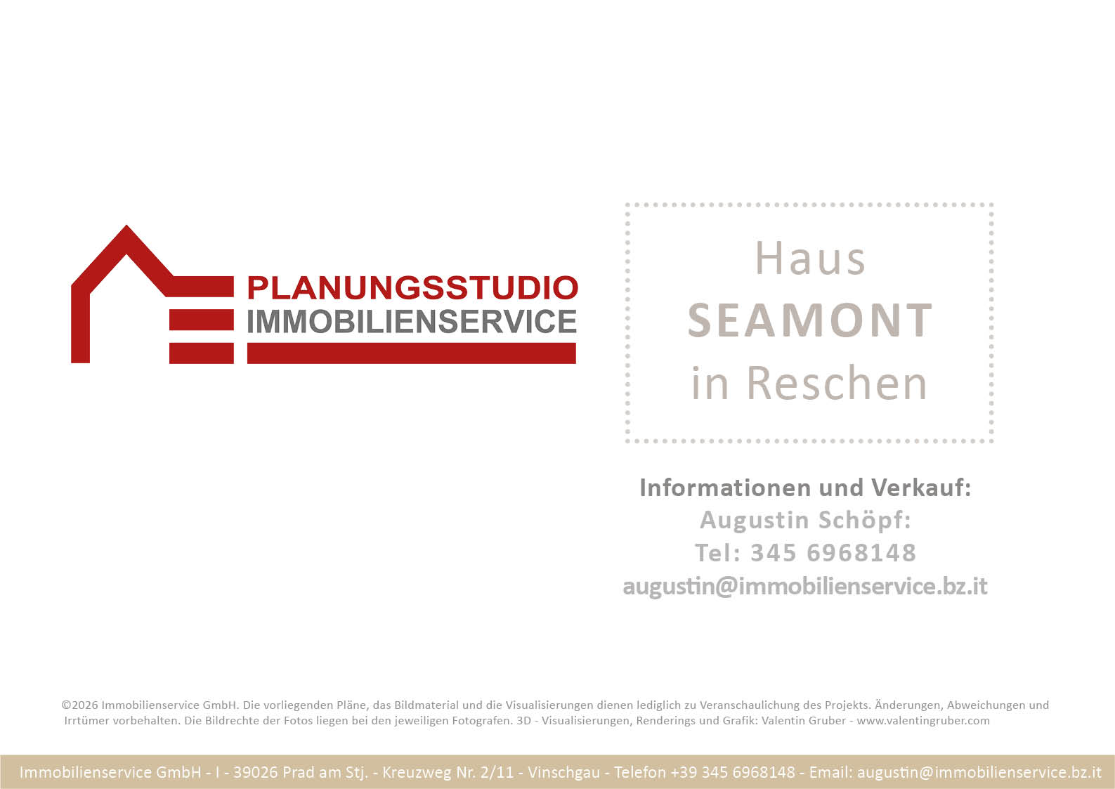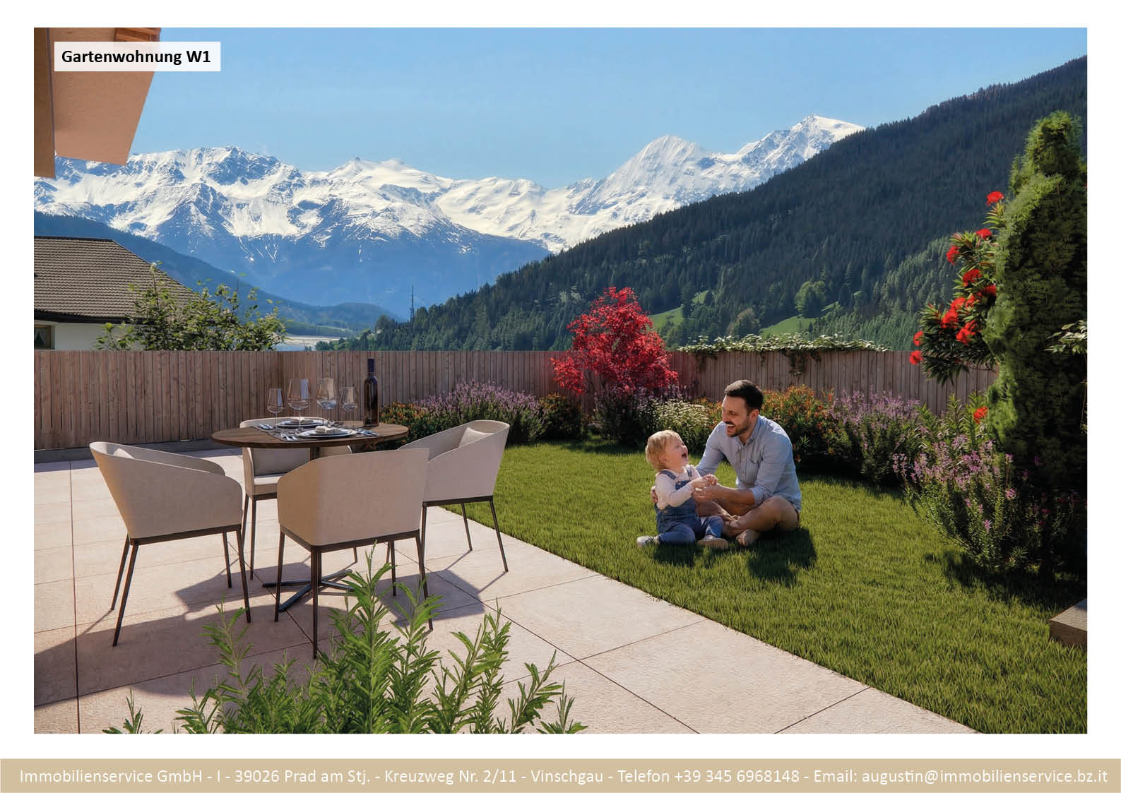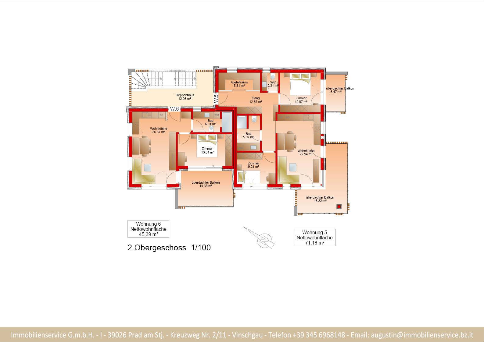 Im Tiefgeschoss befinden sich die Garagenplätze und Kellerräume, sowie die Räume für die Haustechnik. Im Erdgeschoss entstehen zwei Terrassenwohnungen mit Grünflächen (W1 und W2). Diese zwei Wohnungen unterliegen der sogenannten Konvention lt. Art 39 des Landesgesetzes und dürfen nicht als Zweitwohnsitz verwendet werden. Im ersten Obergeschoss entstehen ebenfalls zwei Wohnungen mit schönen Aussichtsloggien und Gartenflächen (W3 und W4). Die Wohnung 4 unterliegt auch der Konvention lt. Art. 39 des Landesgesetzes und darf nicht als Zweitwohnsitz verwendet werden. Die Wohnung 3 ist als Zweitwohnsitz bzw. Ferienwohnung zugelassen. Im zweiten Obergeschoss entstehen zwei Wohnungen mit besonders schönen überdachten Aussichtsterrassen (W5 und W6). Die Wohnung 6 unterliegt der Konvention lt. Art. 39 des Landesgesetzes und darf nicht als Zweitwohnsitz verwendet werden. Die Wohnung 5 ist als Zweitwohnsitz bzw. Ferienwohnung zugelassen.