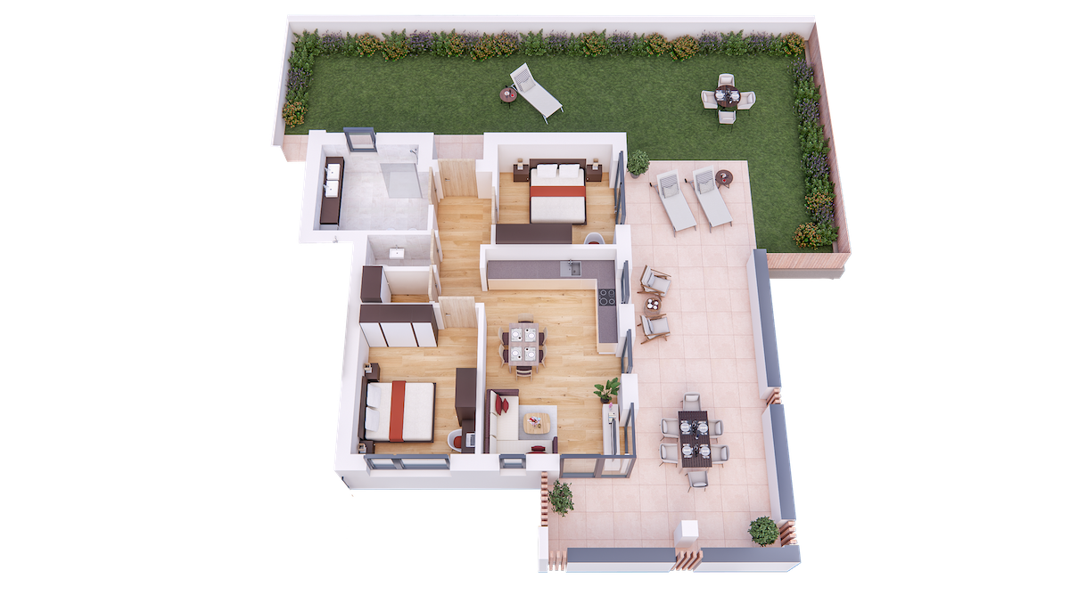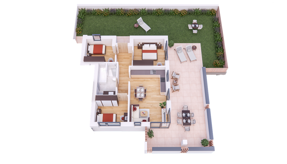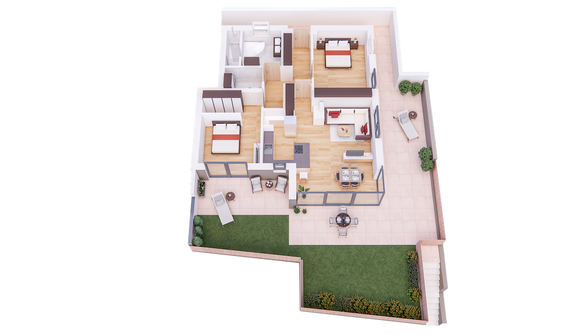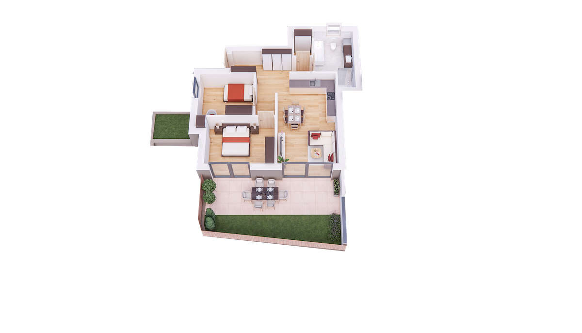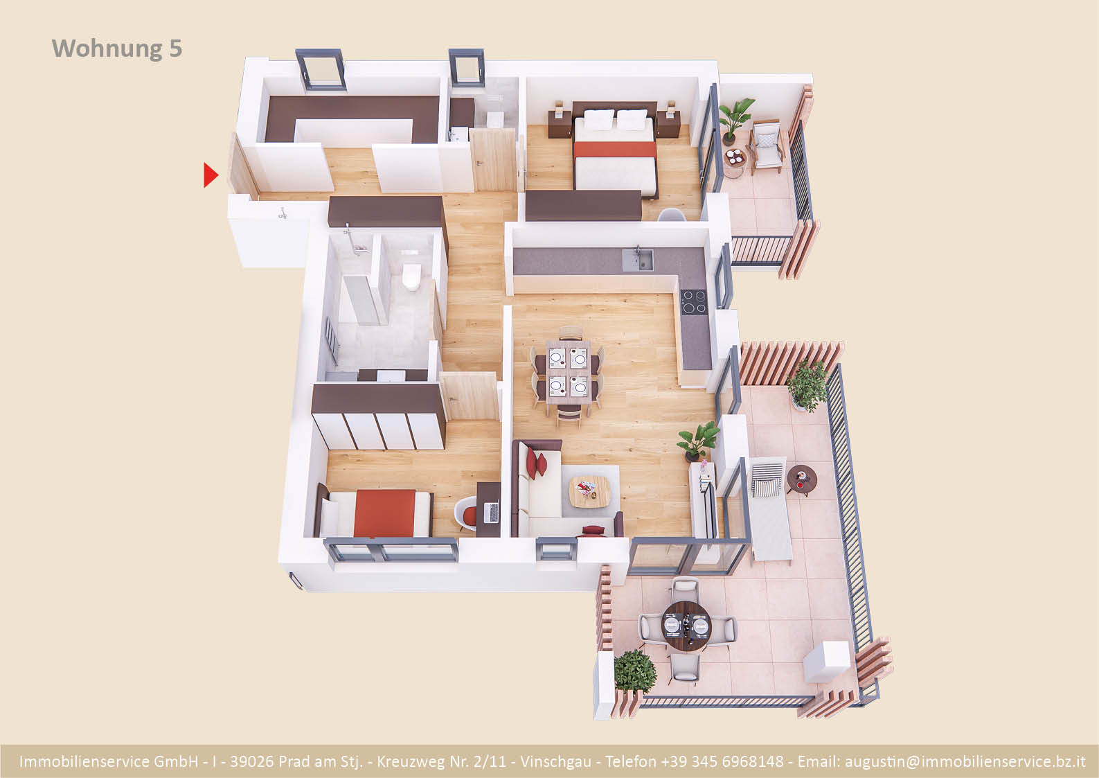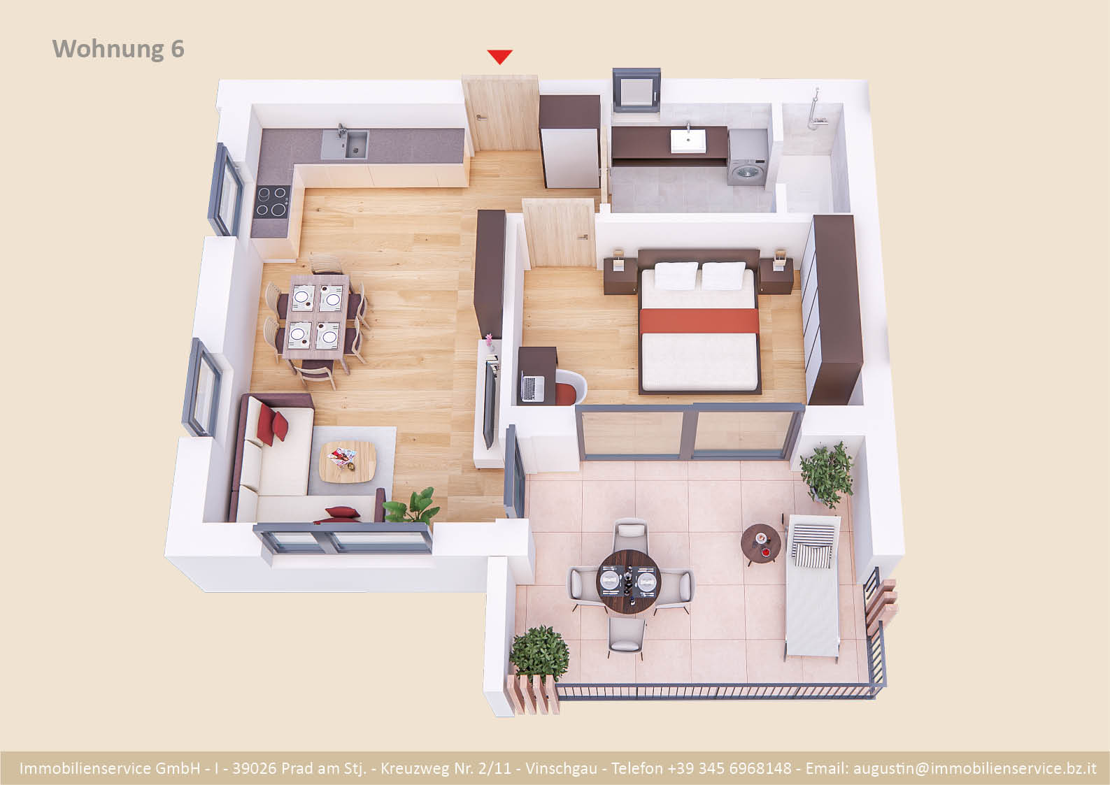 Im Tiefgeschoss befinden sich die Garagenplätze und Kellerräume, sowie die Räume für die Haustechnik. Im Erdgeschoss entstehen zwei Terrassenwohnungen mit Grünflächen (W1 und W2). Diese zwei Wohnungen unterliegen der sogenannten Konvention lt. Art 39 des Landesgesetzes und dürfen nicht als Zweitwohnsitz verwendet werden. Im ersten Obergeschoss entstehen ebenfalls zwei Wohnungen mit schönen Aussichtsloggien und Gartenflächen (W3 und W4). Die Wohnung 4 unterliegt auch der Konvention lt. Art. 39 des Landesgesetzes und darf nicht als Zweitwohnsitz verwendet werden. Die Wohnung 3 ist als Zweitwohnsitz bzw. Ferienwohnung zugelassen. Im zweiten Obergeschoss entstehen zwei Wohnungen mit besonders schönen überdachten Aussichtsterrassen (W5 und W6). Die Wohnung 6 unterliegt der Konvention lt. Art. 39 des Landesgesetzes und darf nicht als Zweitwohnsitz verwendet werden. Die Wohnung 5 ist als Zweitwohnsitz bzw. Ferienwohnung zugelassen.